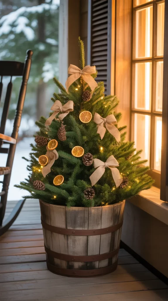 Instead of a traditional stand, place a small Christmas tree in a wooden barrel or basket. Decorate it with natural ornaments like dried oranges, cinnamon sticks, and small pinecones.