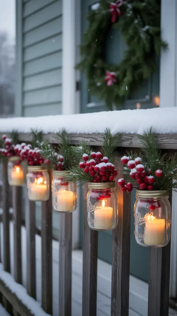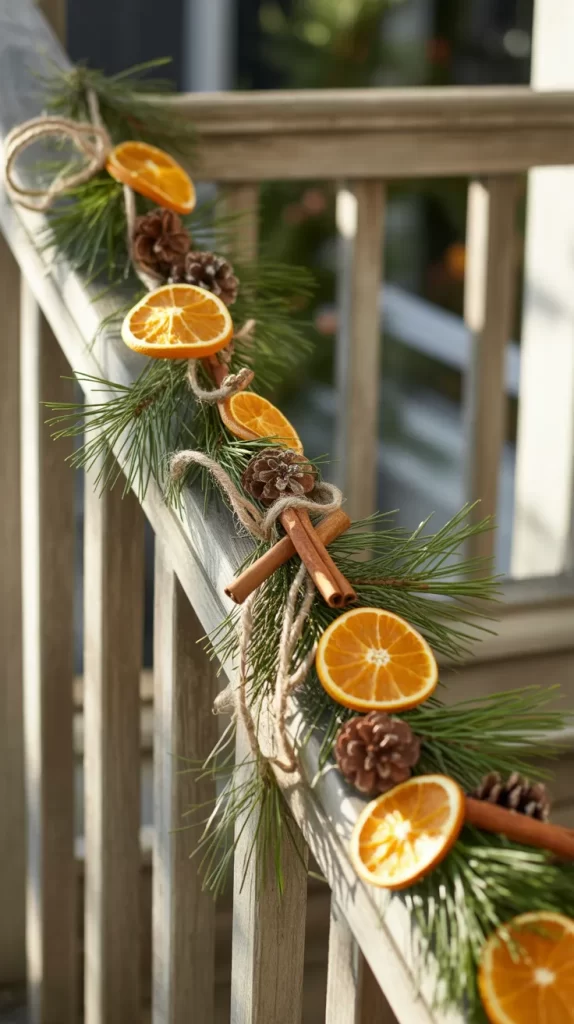 Wrap your porch railing with garlands made from fresh greenery. Use a mix of pine, cedar, and eucalyptus branches for a full, textured look. Add pinecones, berries, or dried fruit slices for decoration.