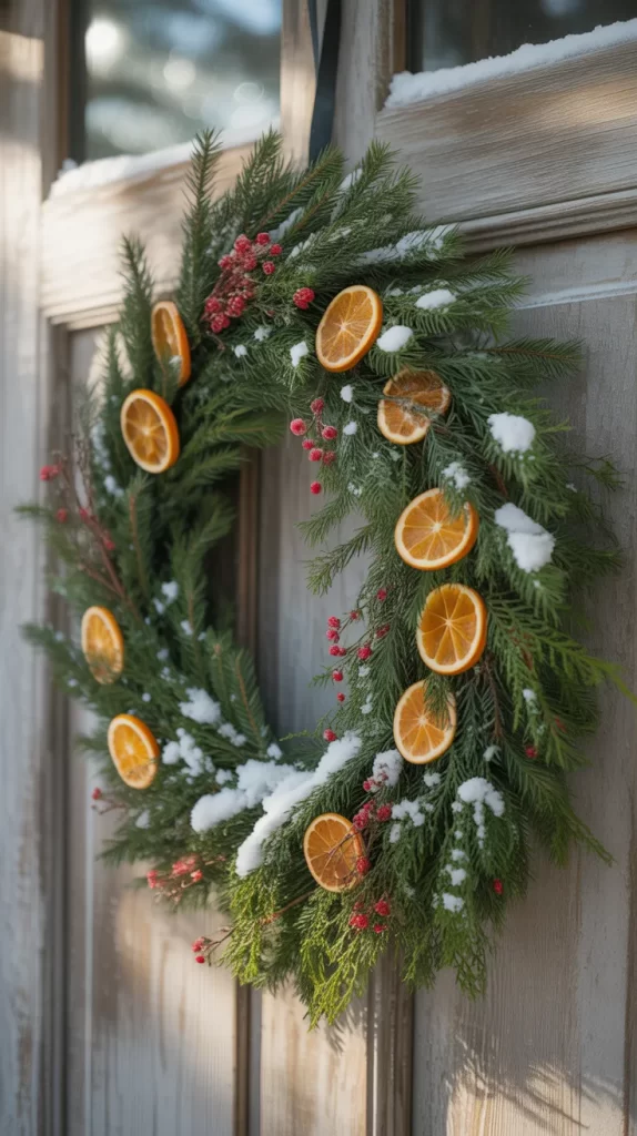 Nothing says Christmas like a wreath made from fresh evergreen branches. Gather pine, cedar, or fir branches and secure them around a wire or grapevine wreath frame. Decorate it with berries, dried oranges, and a big red bow for a festive finish.
