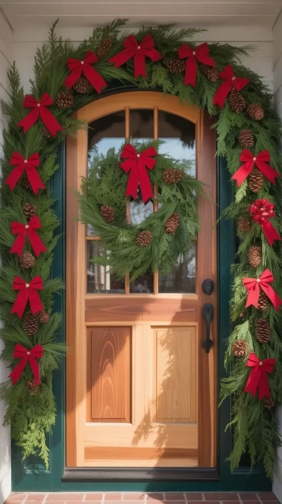 Frame your front door with bundles of fresh greenery. Secure them using floral wire and finish with red bows or pinecones.
