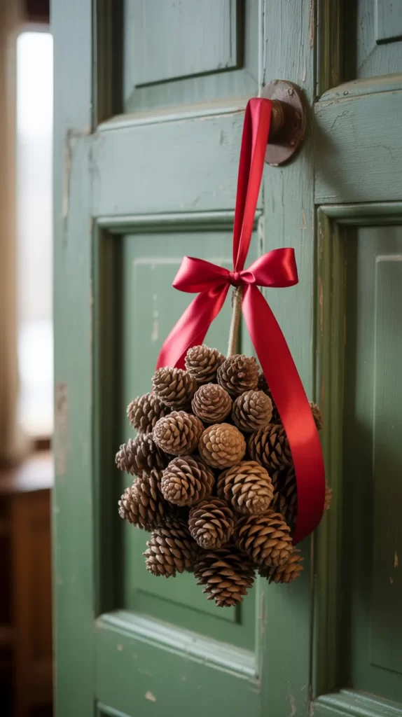 Instead of a wreath, make a hanging decoration using a bundle of pinecones tied together with ribbon. Hang it vertically from your door handle.