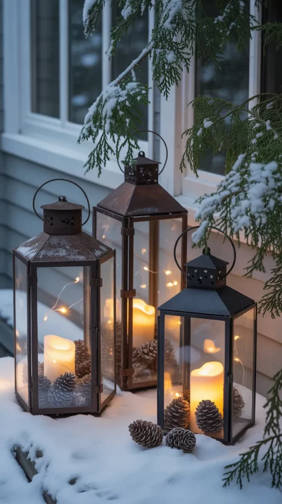 Add sprigs of greenery or berries around the lantern bases to tie them together. This simple display adds elegance and warmth to your porch.