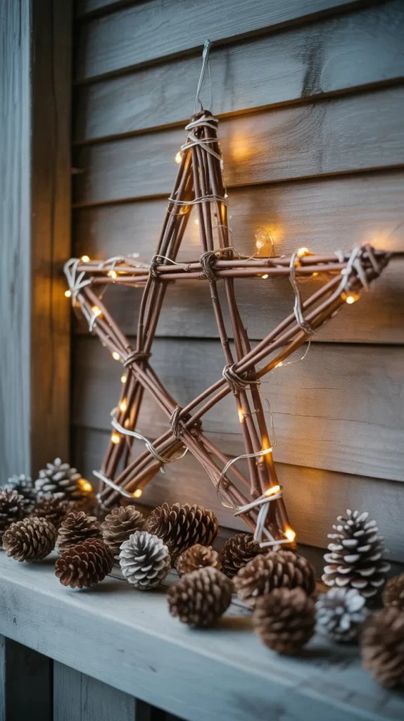 Create star shapes using twigs and twine, then hang them on your porch wall. You can decorate them with fairy lights, pinecones, or small ornaments.