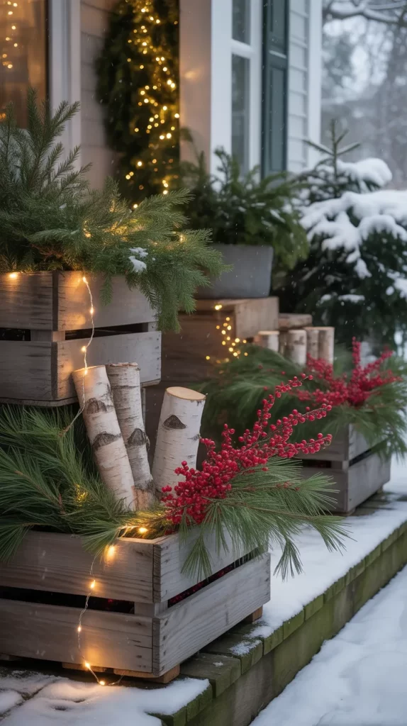 Turn old wooden crates into beautiful Christmas planters. Fill them with pine branches, holly, and birch logs. Add a few pinecones and fairy lights to make them glow at night.