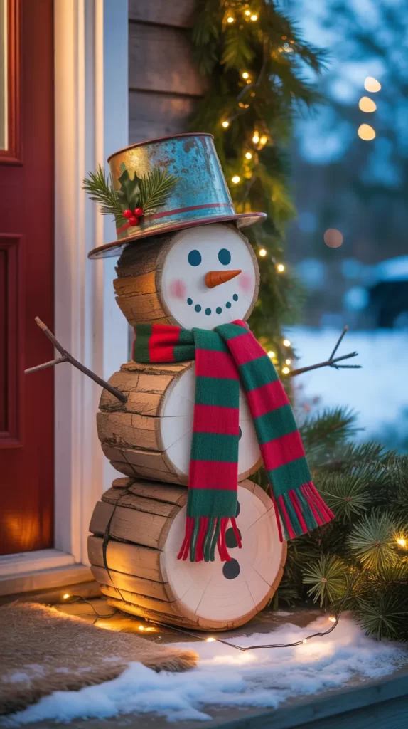 Use three wooden discs or logs of different sizes to build a snowman. Stack and secure them, then paint a smiling face and wrap a scarf around its neck. Add a stick for arms and a tin bucket hat for fun!