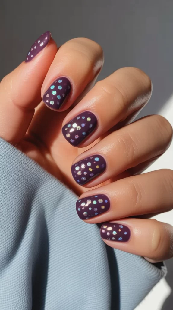 Use a dark purple polish for the base and create small holographic dots on accent nails. This simple addition transforms plain nails into a glittery, festive design without taking much time.