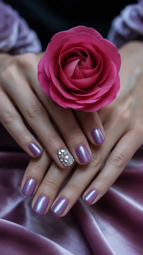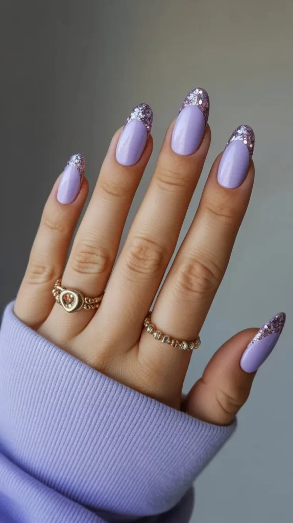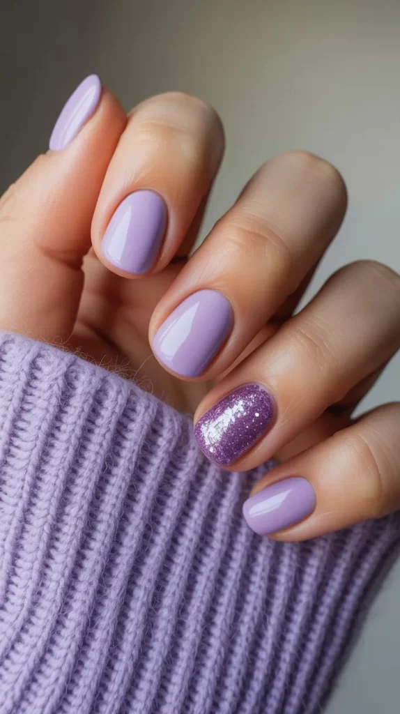 Paint most nails in a soft lavender shade and add glitter to one or two accent nails. Use chunky or fine purple glitter for a playful and festive look. This design is ideal for beginners and last-minute DIY nail prep.