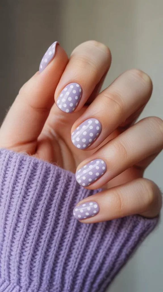 Paint all nails with a soft lavender base and create white polka dots using a dotting tool or toothpick. The simple pattern is playful, girly, and perfect for a DIY Halloween manicure without complicated techniques.