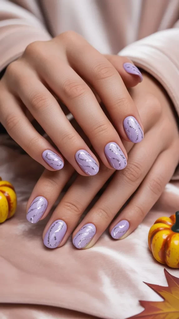 Paint nails in pastel purple and create small swirls on accent nails using silver glitter polish. The swirls can be simple curves or loops for a whimsical look.