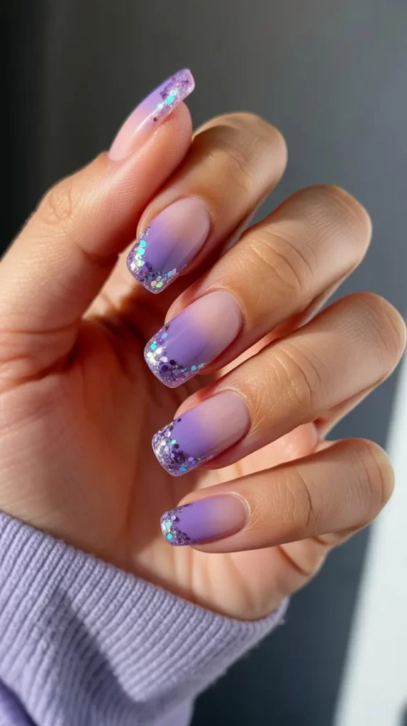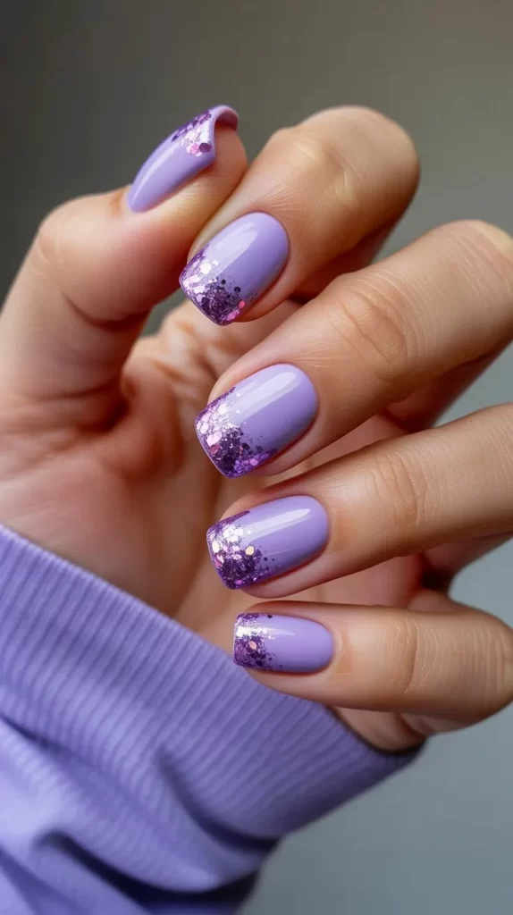 Apply a medium purple base and fade glitter from the cuticle or tip. The glitter gradient effect creates a magical look with minimal effort.