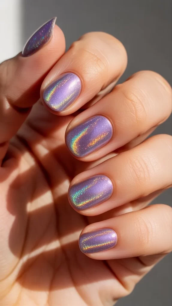 You can add small accent nails with silver or gold glitter for extra sparkle. This design is quick, DIY-friendly, and works well on all nail lengths. The holographic effect adds depth and makes your nails stand out at parties.