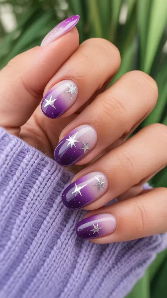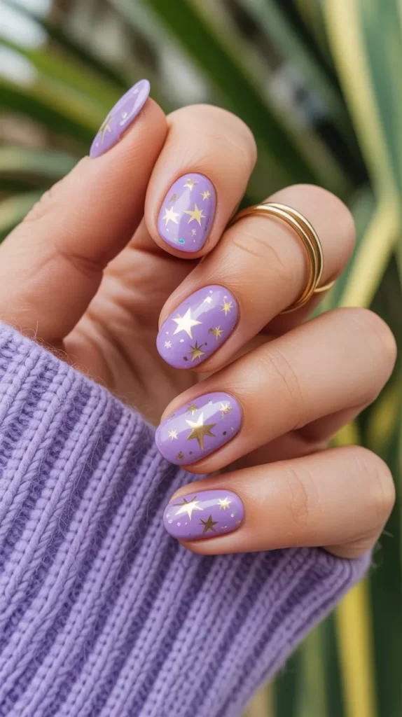 Star accents are quick to apply and give nails a fun, celestial vibe. Pair with a simple purple topcoat on other nails for balance. This design works for both short and long nails, making it perfect for DIY enthusiasts.
