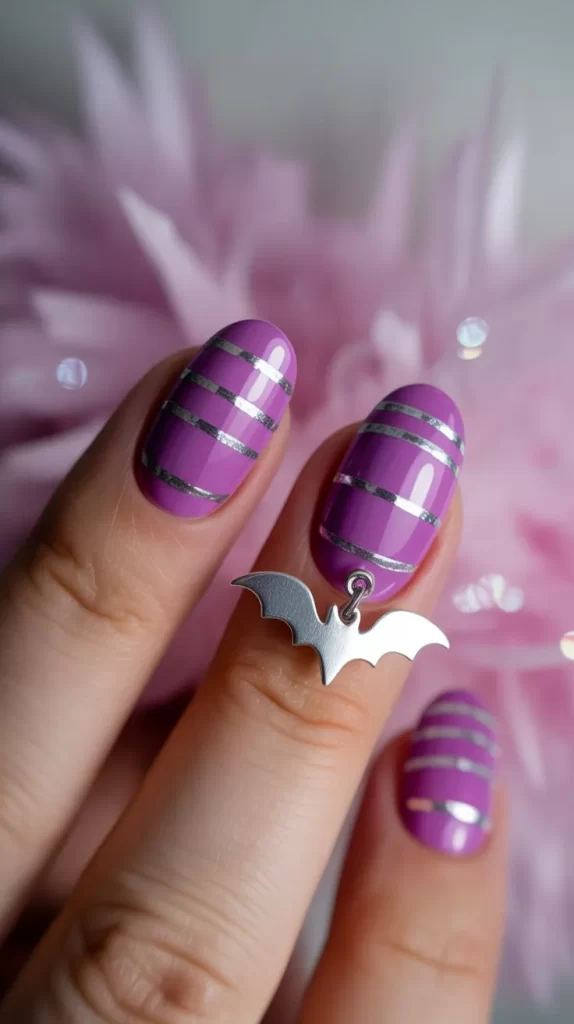 Paint your nails in a medium purple shade and use thin metallic glitter or silver tape to create vertical or diagonal stripes. Stripes add a modern touch while maintaining a Halloween vibe.