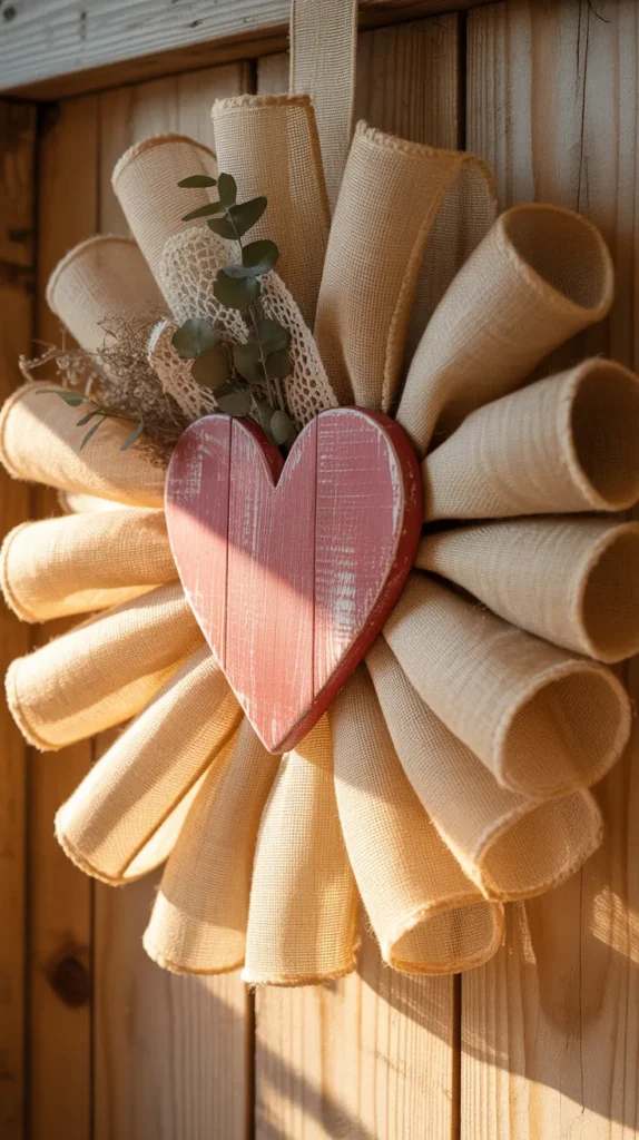 A burlap heart wreath fits perfectly with farmhouse-style decor. Burlap ribbon wrapped around a wreath form creates texture, while a heart centerpiece adds a clear Valentine’s theme. This design feels warm, rustic, and inviting.