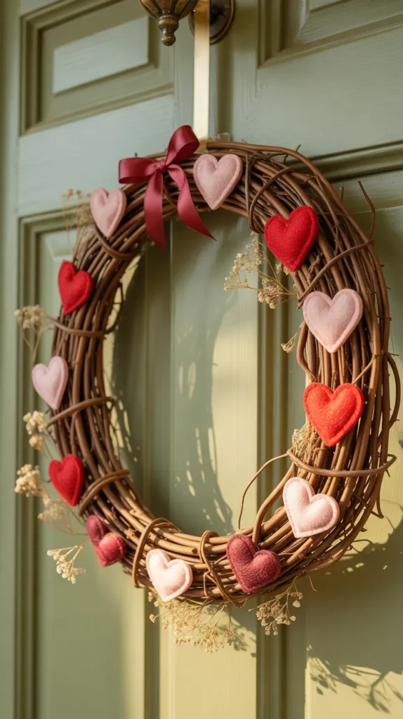 A grapevine wreath with heart-shaped accents is a timeless Valentine’s Day favorite. The natural texture of the grapevine pairs perfectly with red and pink hearts made from wood, felt, or cardstock. This design looks welcoming on a front door and adds instant seasonal charm without feeling overdone.