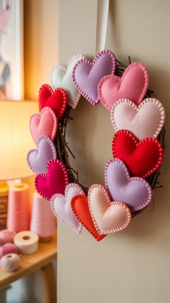 Felt heart wreaths are soft, colorful, and full of charm. Layering hearts in different sizes adds depth and creates a playful look that works well in family homes. This wreath is lightweight and easy to hang anywhere indoors.