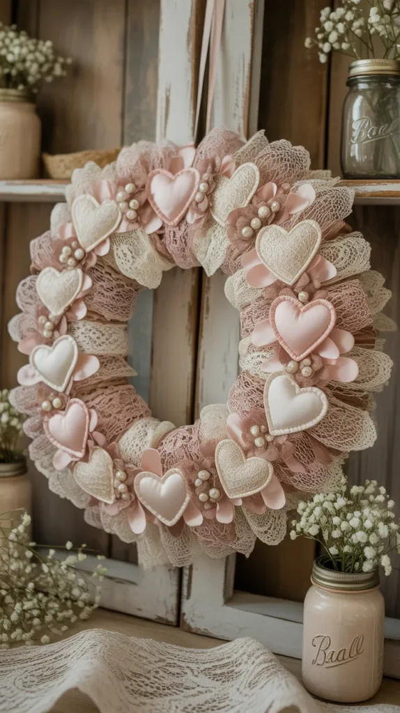 Lace wreaths offer a soft and elegant vintage look. Wrapping lace ribbon around a wreath base and adding heart details creates a romantic feel.