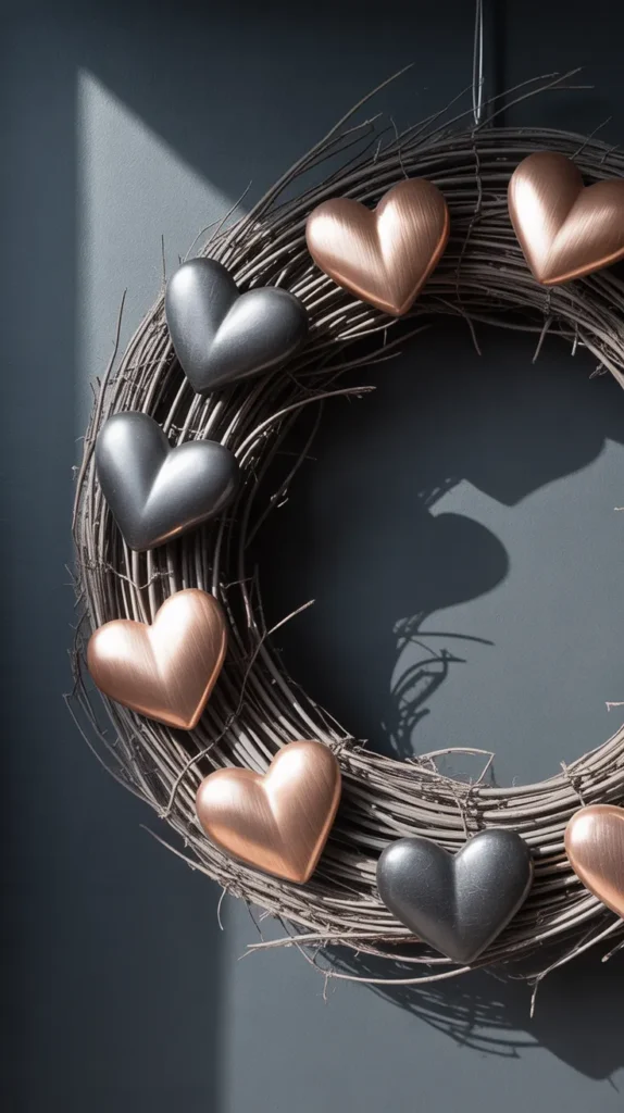 Metal heart accents give Valentine’s decor a bold and modern edge. Paired with a dark wreath base, this style suits contemporary homes.