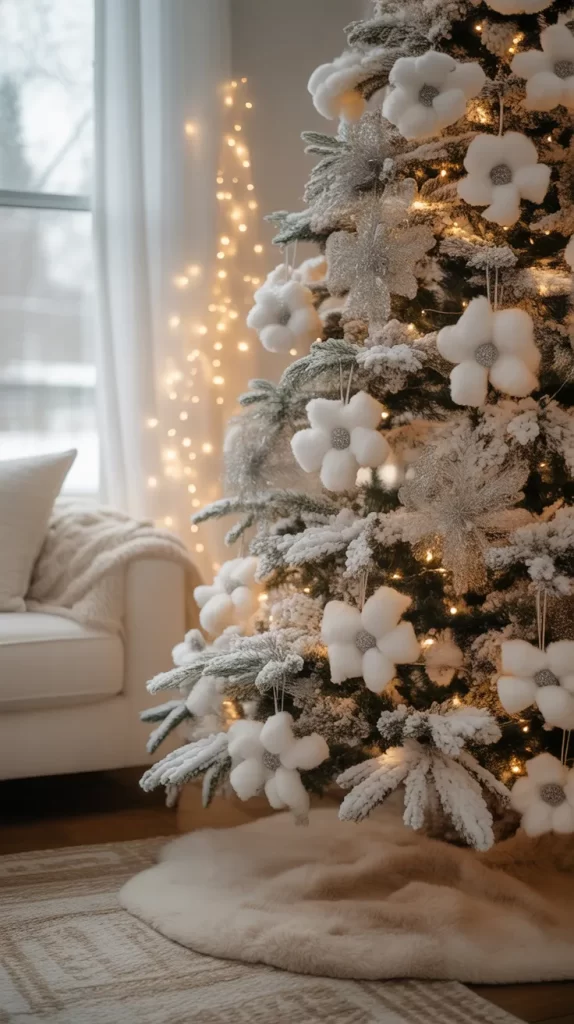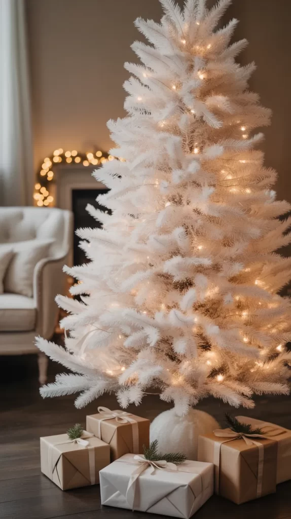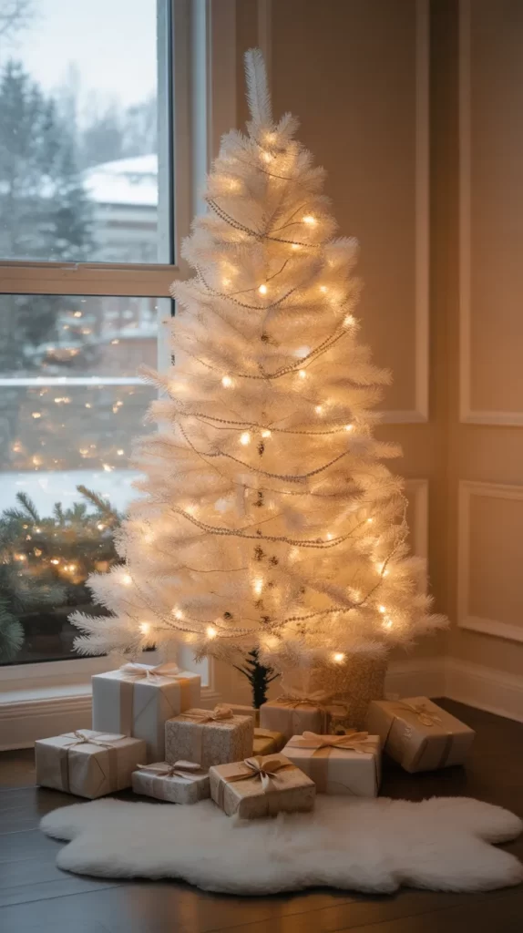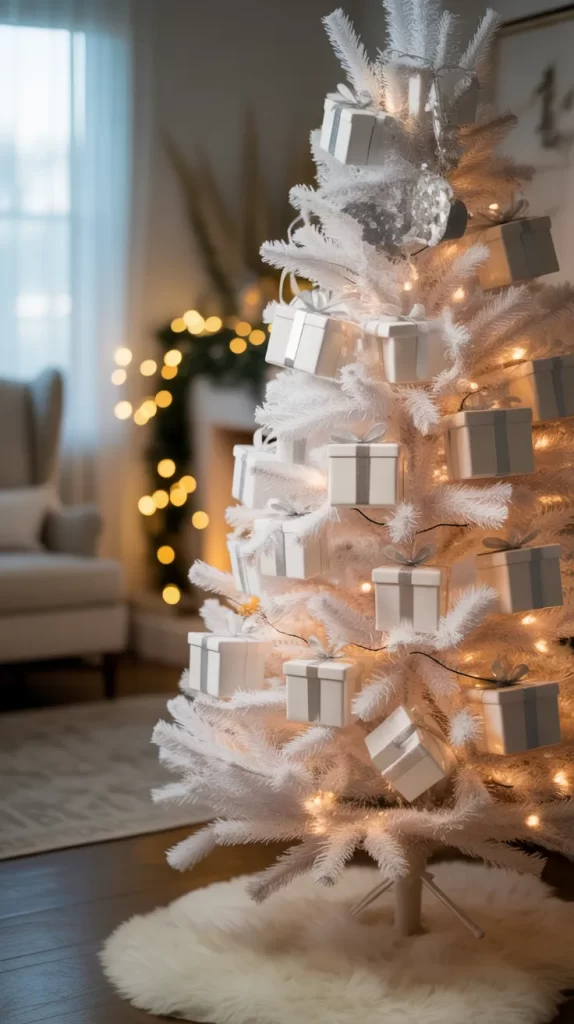 Mini white gift boxes can double as ornaments. Wrap small boxes with white paper, tie with silver or white ribbon, and add tiny beads or bells. Hang them on the tree branches for a festive, playful look.