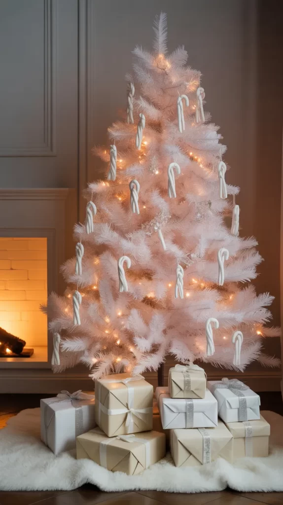 Candy cane ornaments bring a classic holiday vibe to your white tree. You can make them from white clay or paint existing candy canes white. Add glitter or stripes in silver for sparkle. Hang them with ribbons for a playful and festive look.