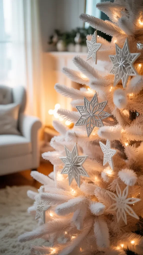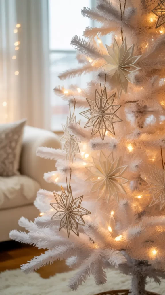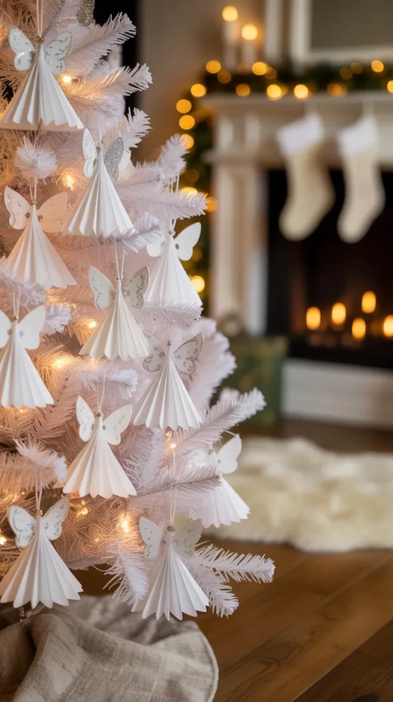 Paper angels are a lovely, traditional touch for a white Christmas tree. Cut angel shapes from white cardstock or craft paper. Decorate them with glitter, beads, or metallic markers. Attach a string to hang them. You can make different sizes to create depth and interest.