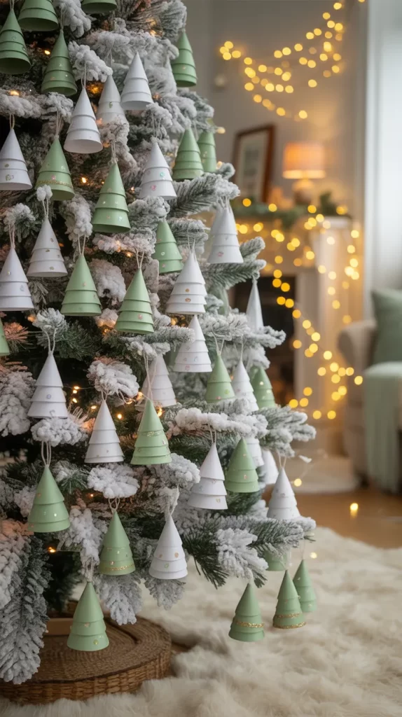 Paper cones are a fun way to create miniature Christmas trees for your big white tree. Roll white cardstock into small cone shapes and secure with glue. Decorate them with glitter, sequins, or tiny beads to make them festive. You can hang them upside down or upright on your branches for a unique look.
