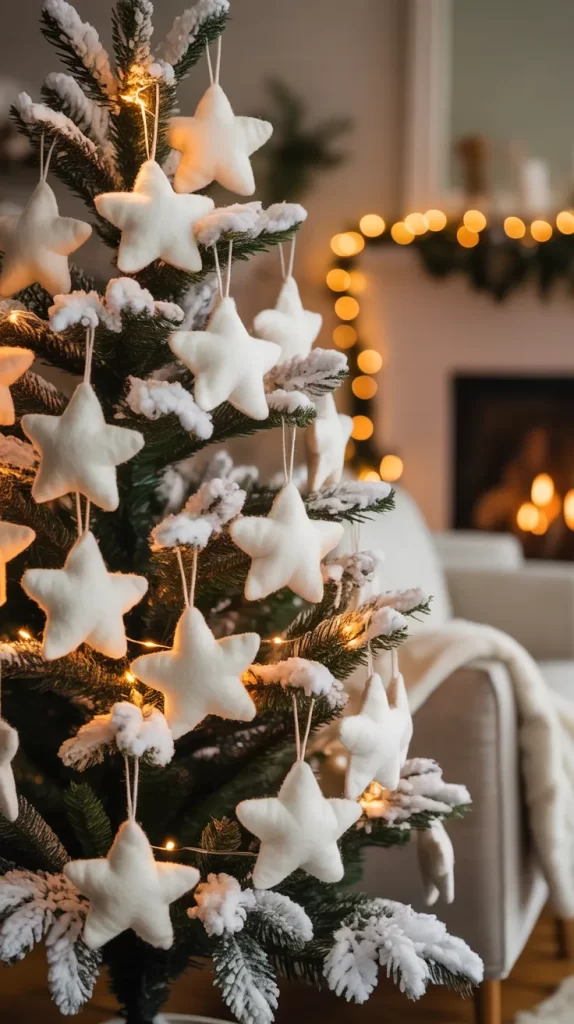 White felt stars are simple yet elegant ornaments. Cut stars from thick white felt using a stencil or freehand. For dimension, you can sew or glue two stars together with some stuffing inside to make them puffy. Add a small ribbon loop to hang them on the tree. These felt stars look charming and soft, adding texture to your decorations.