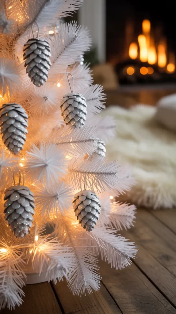White pinecone decorations mix natural elements with a wintry aesthetic. They are perfect for adding texture and depth, creating a snowy woodland vibe. Combining pinecones with fairy lights or snowflake ornaments enhances the cozy, magical feeling of your holiday decor.