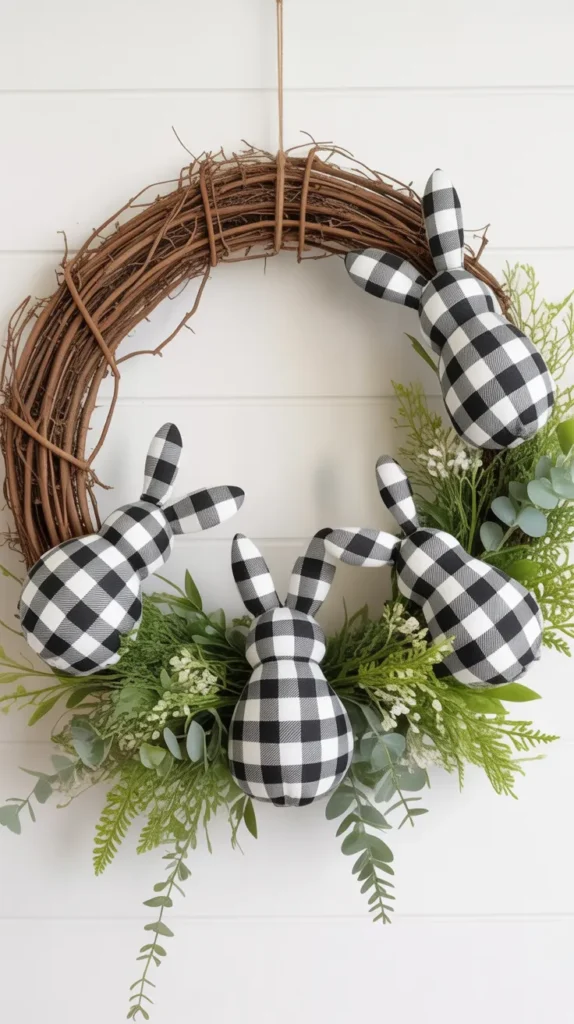 Use buffalo check ribbon for bunny ears and bows on a grapevine wreath. Add greenery and a simple bunny face. This look blends rustic and modern styles beautifully.