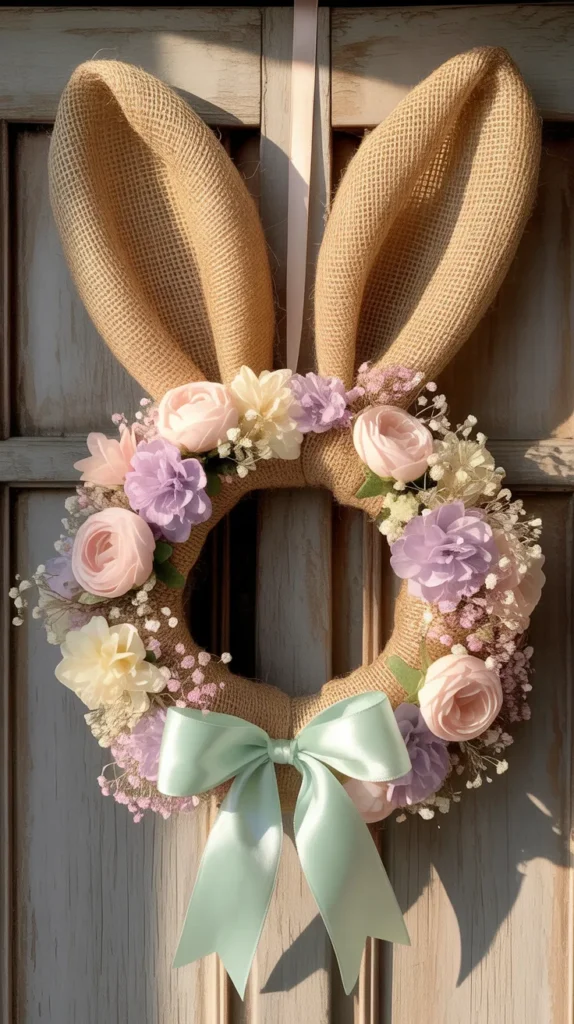 Wrap a foam wreath form with burlap ribbon and add oversized bunny ears on top. Finish with a pastel bow and small florals. The neutral base works with almost any color scheme.