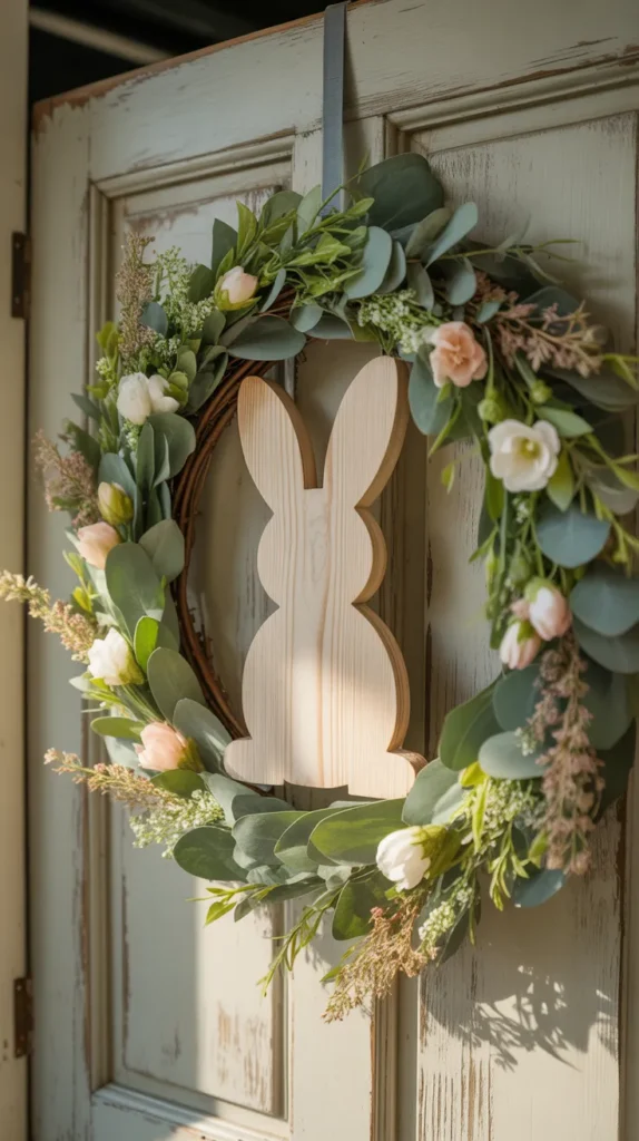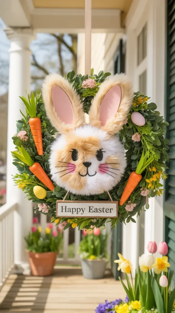 Design a bunny wreath surrounded by faux carrots and greenery. Add a small sign that says “Happy Easter” for extra charm. This playful style is great for families and kid-friendly homes.