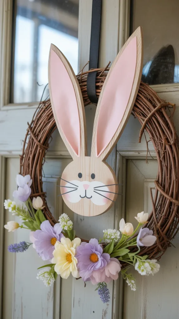 Start with a Dollar Tree grapevine wreath and add bunny ears made from wired ribbon. Attach a small bunny face in the center and finish with soft pastel florals. This design feels timeless and works with farmhouse, cottage, or traditional homes.