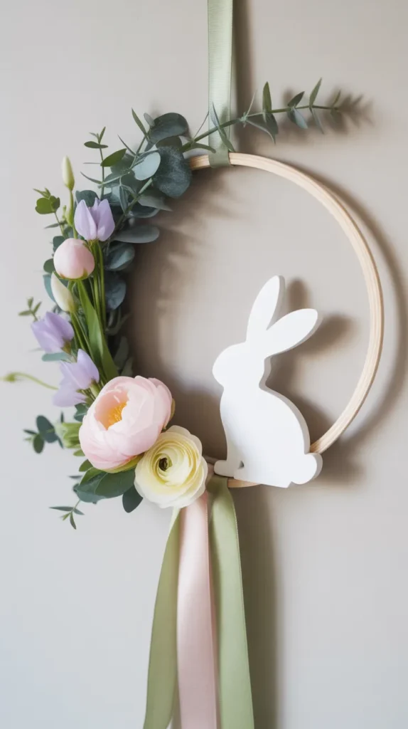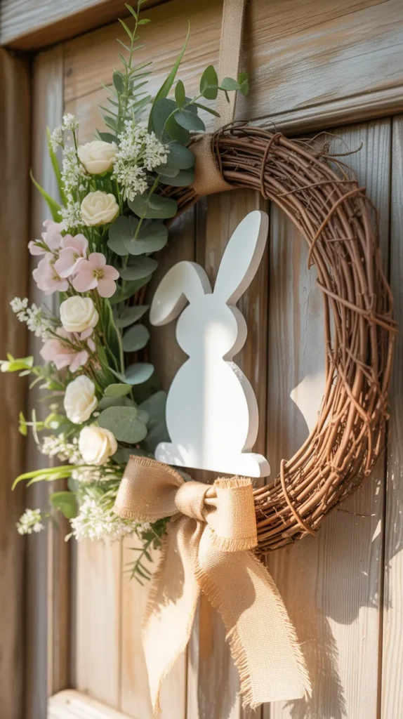 Create bunny ears using floral wire and wrap them with wooden beads. Attach the ears to a simple round wreath and finish with greenery and a bow. This minimalist style works well in modern farmhouse homes.