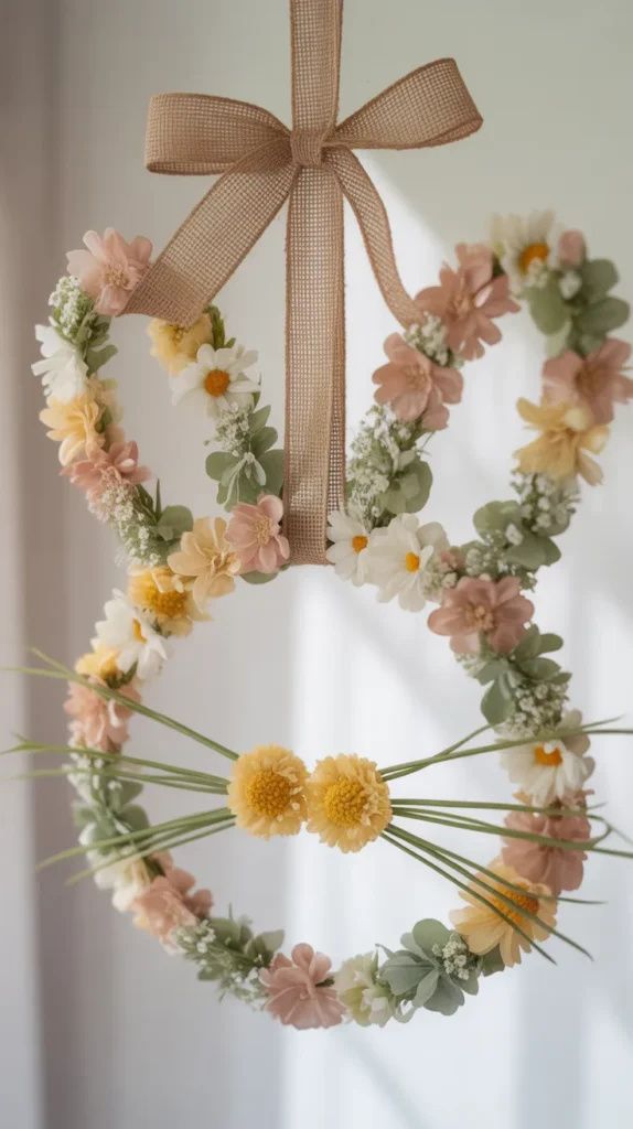 Shape a wire frame into a bunny head and cover it with faux florals from Dollar Tree. Use mixed spring colors or stick to neutrals for a modern look. Hang it with burlap ribbon for rustic charm.