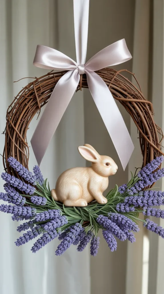 Use faux lavender stems to fill a bunny wreath frame. Finish with a white bow for a calm, elegant look.