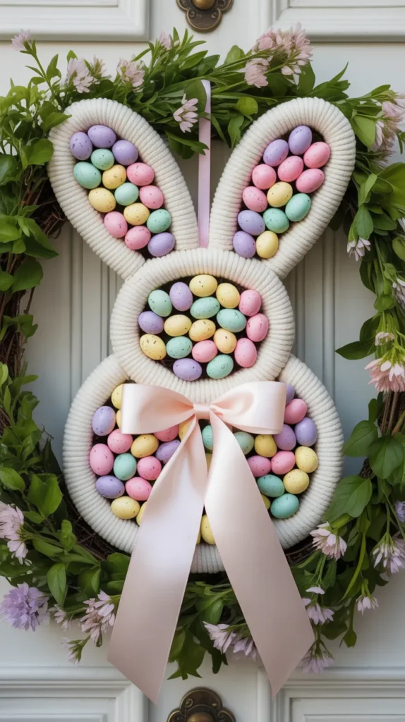 Glue mini Easter eggs around a bunny-shaped wreath form. Add ears and a small bow for detail. This colorful design looks great on bright doors and porch walls.