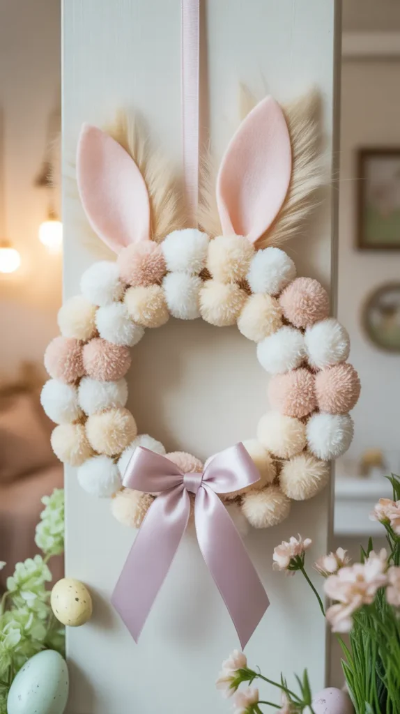 Cover a wire frame with white pom poms to create a fluffy bunny shape. Add felt ears and a pastel bow. This cozy design feels playful and soft, perfect for indoor walls or nursery doors.