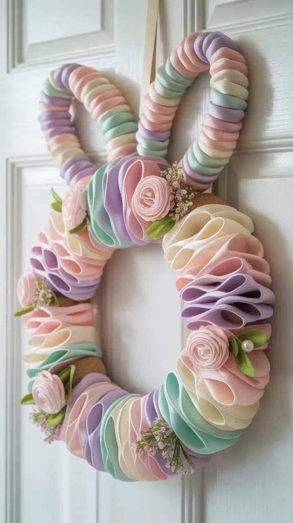 Use white deco mesh to form a fluffy bunny-shaped wreath. Add pink inner ears, a bow, and small Easter eggs for detail. This bold style pops on any front door and looks much more expensive than it is.