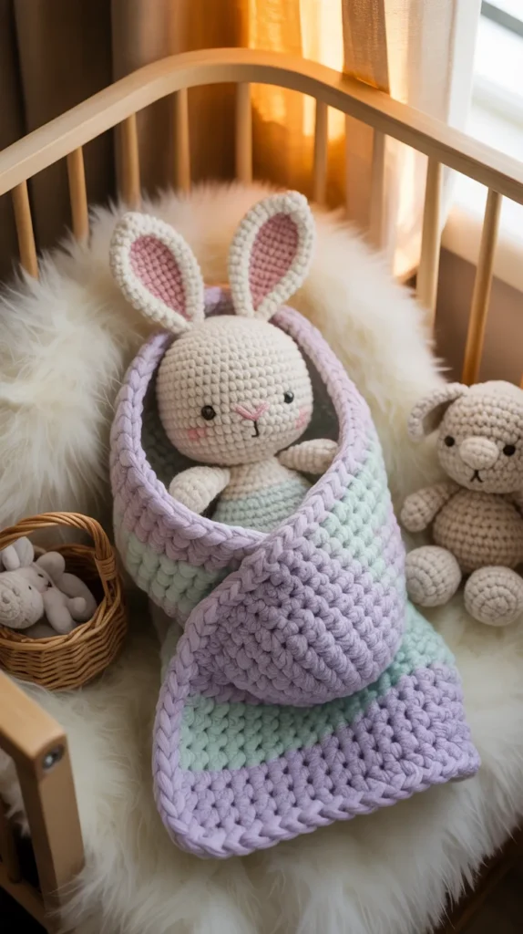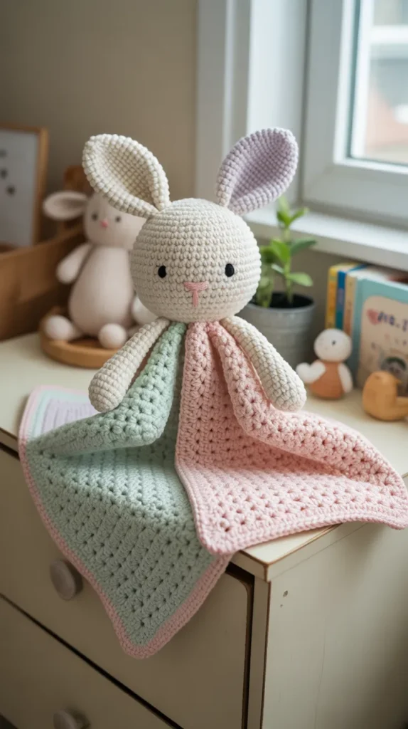 A bunny lovey combines a small bunny head with a soft crochet blanket body. It works as both comfort toy and decoration, making it a smart purchase for babies and toddlers.