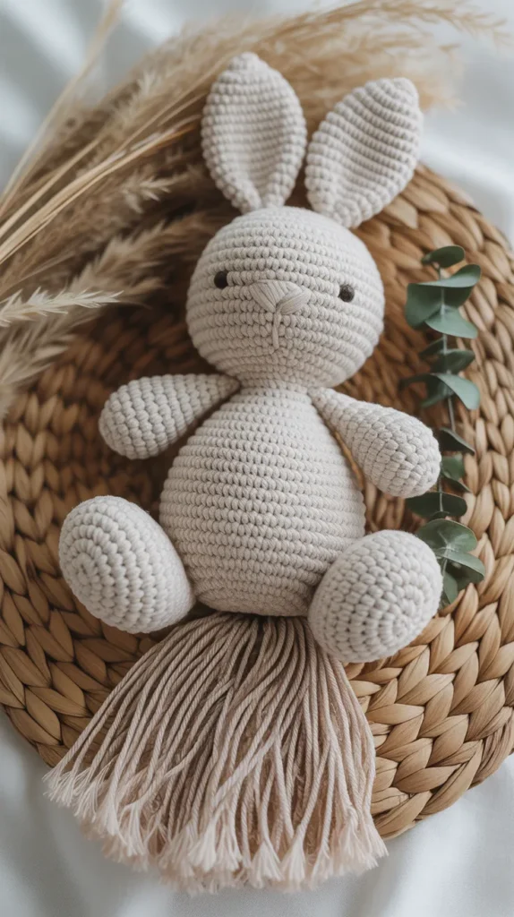 Boho bunny toys include fringe tails or textured yarn accents. They fit modern bohemian interiors and Pinterest-inspired spaces. Neutral yarn keeps costs low while adding trendy detail.