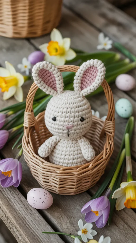This design shows a small bunny sitting inside a crochet basket. It looks detailed but uses basic shapes, making it achievable for most skill levels.