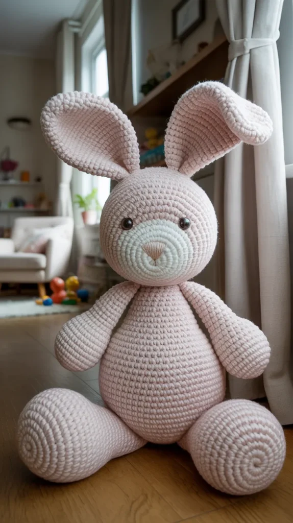 Jumbo crochet bunnies act as statement pieces for nurseries or living rooms. Although they use more yarn, they replace multiple small decorations, making them a cost-effective decor investment.