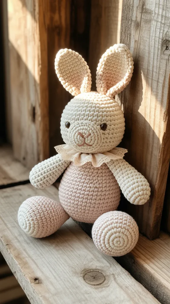 Farmhouse neutral bunny toys use beige, cream, or light gray yarn paired with minimal facial details. This design fits modern farmhouse homes and minimalist decor styles. Because neutral colors never go out of trend, this bunny becomes a long-term decor piece rather than a one-season toy.