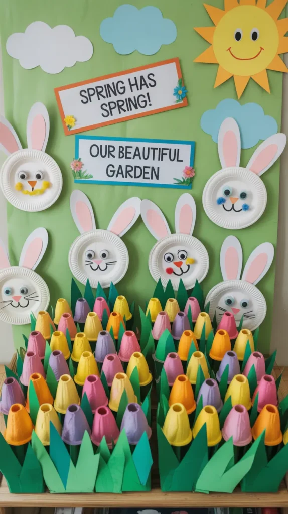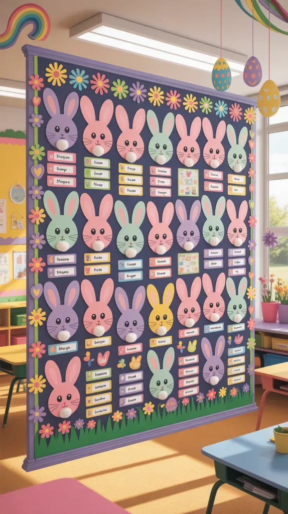 Create a bright bunny-themed bulletin board using pastel paper, cotton tails, and student name cutouts. Add big bunny faces around the edges and place a “Hop Into Spring” message in the center. This welcoming wall instantly lifts classroom energy and helps students feel included.
