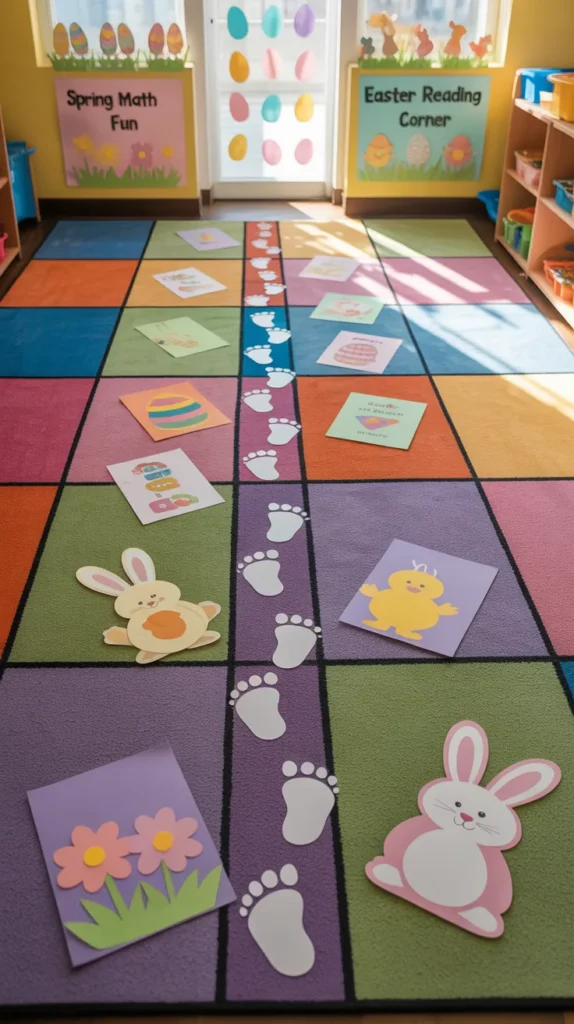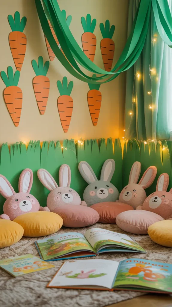 Create a cozy reading corner with paper carrots on the wall and green streamers hanging down. Add bunny pillows or floor mats for comfort. This space encourages quiet reading while keeping the Easter theme strong.