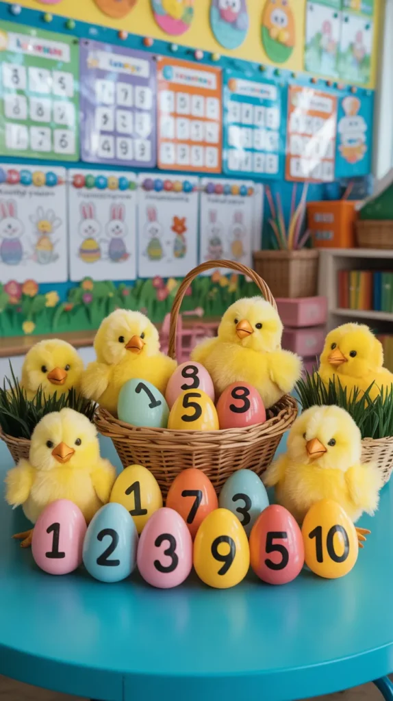 Create a counting area using yellow chick cutouts and numbered eggs. Students match chicks to numbers or solve simple math problems.