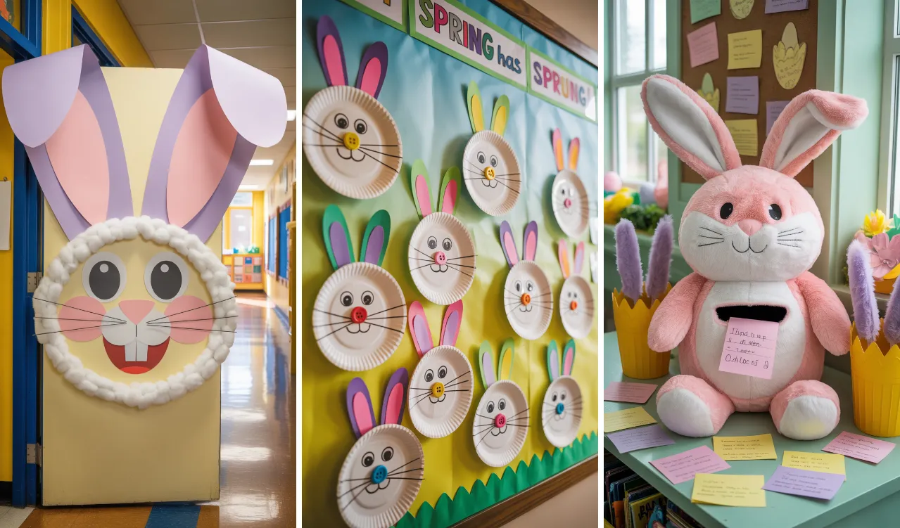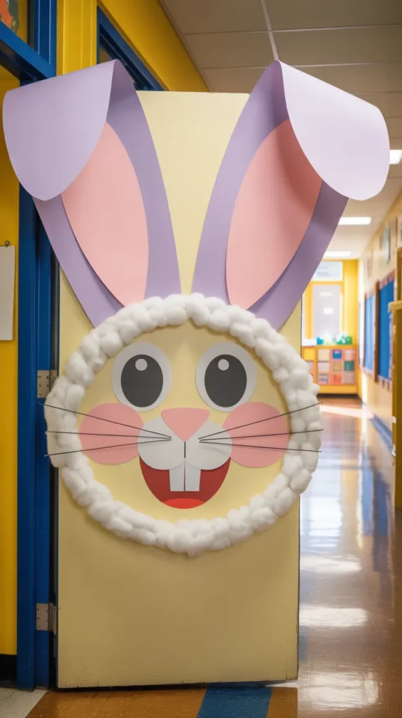 Turn your classroom door into a giant bunny face using paper ears, big eyes, and a pink nose. This instantly creates excitement as students walk in every morning.