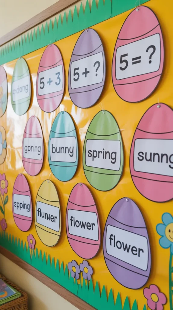 Turn your wall into an Easter egg learning station. Cut large egg shapes and write math problems, sight words, or spelling challenges inside. Students can open flaps or match answers, making learning interactive and fun.