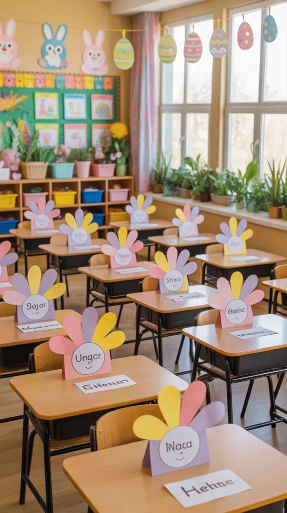 Place small paper flower pots on each desk with positive messages or student names. These mini decorations add cheer while keeping desks organized.