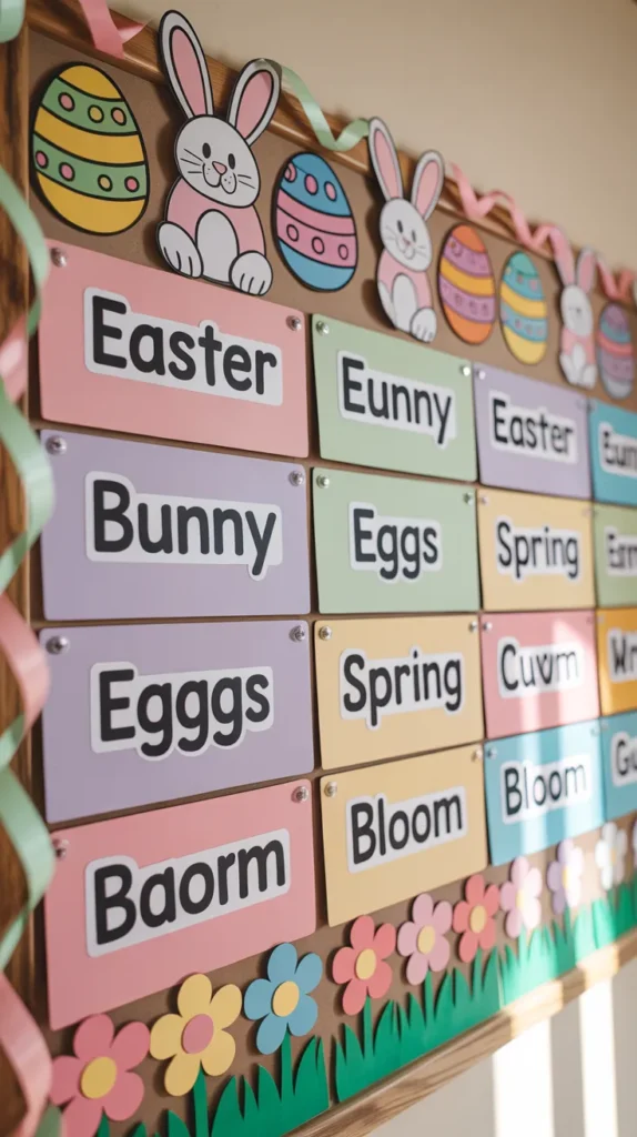 Post Easter-themed words like “bloom,” “hop,” and “sunshine” on colorful cards. This builds vocabulary while keeping walls seasonal and bright.